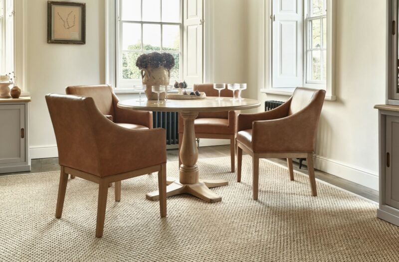Many materials age over time, so you’ll want to consider not just how they look when purchased new, but also how they will look years down the line after many uses. For example, leather is easy to look after but will develop a natural patina over time. If your dining room has a sunny window, be aware that some fabrics may fade when exposed to sunlight.