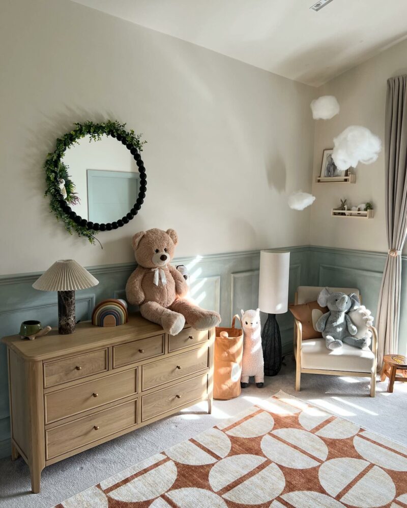 Incorporate storage that blends seamlessly with your decor such as footstools with hidden compartments, sleek sideboards, stylish baskets, and shelving units to keep toys organised and easily accessible.
