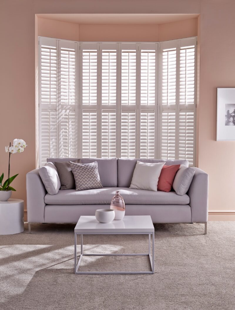 Bay windows really benefit from made-to-measure solutions such as Roman blinds or shutters that follow the curve of the bay. For large glass doors, we recommend tracked shutters or Intu blinds, which fit into the door frame and allow easy, unobstructed access. It’s also worth considering electric blinds, as you can open them with a simple remote, or pair them with a smart hub. You can use an app or even a Google or Amazon device to control it with your voice.