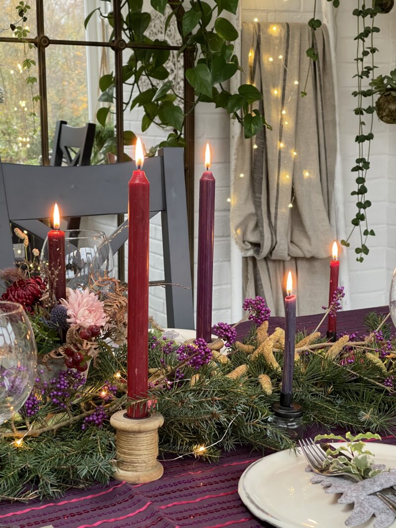 Foraged green foliage makes a statement centrepiece, with the purple berries, jewel-toned baubles and candles adding a dash of warming colour. This is a more eclectic look yet feels welcoming and festive – it’s definitely somewhere you’d want to linger over your Christmas dinner!
