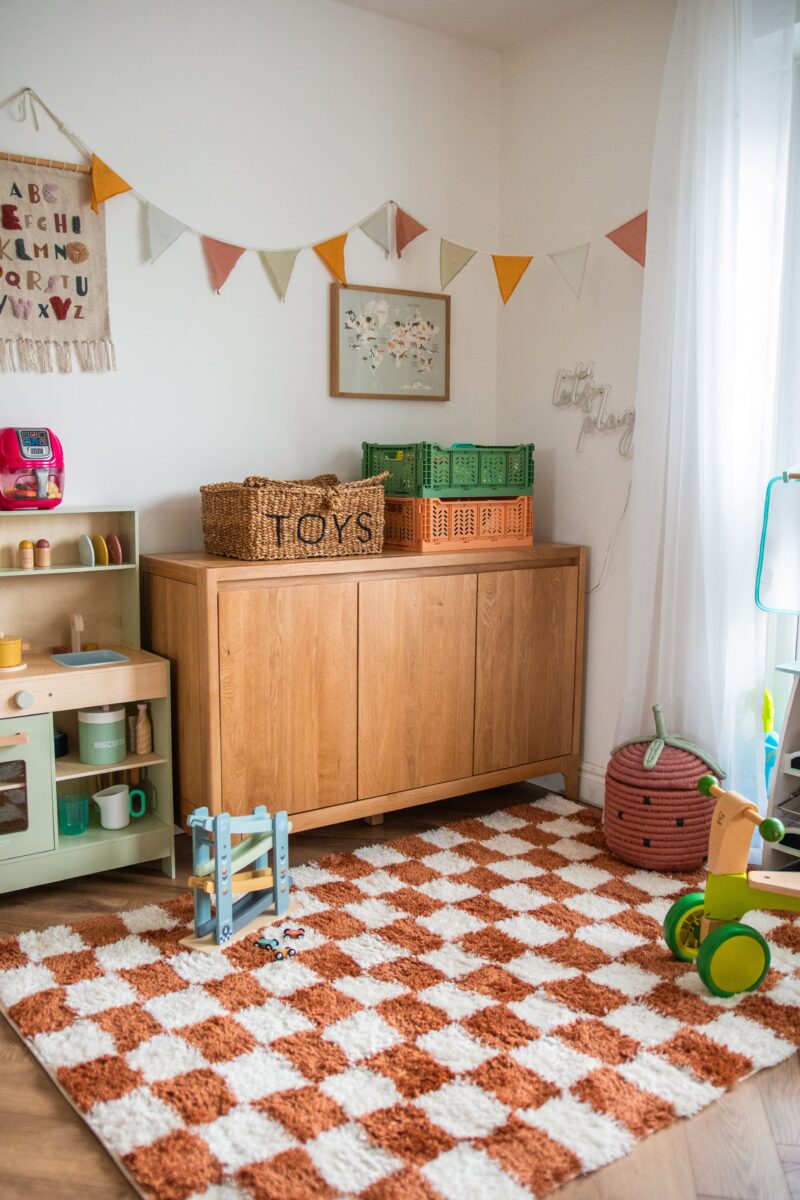 Incorporate storage that blends seamlessly with your decor such as footstools with hidden compartments, sleek sideboards, stylish baskets, and shelving units to keep toys organised and easily accessible.