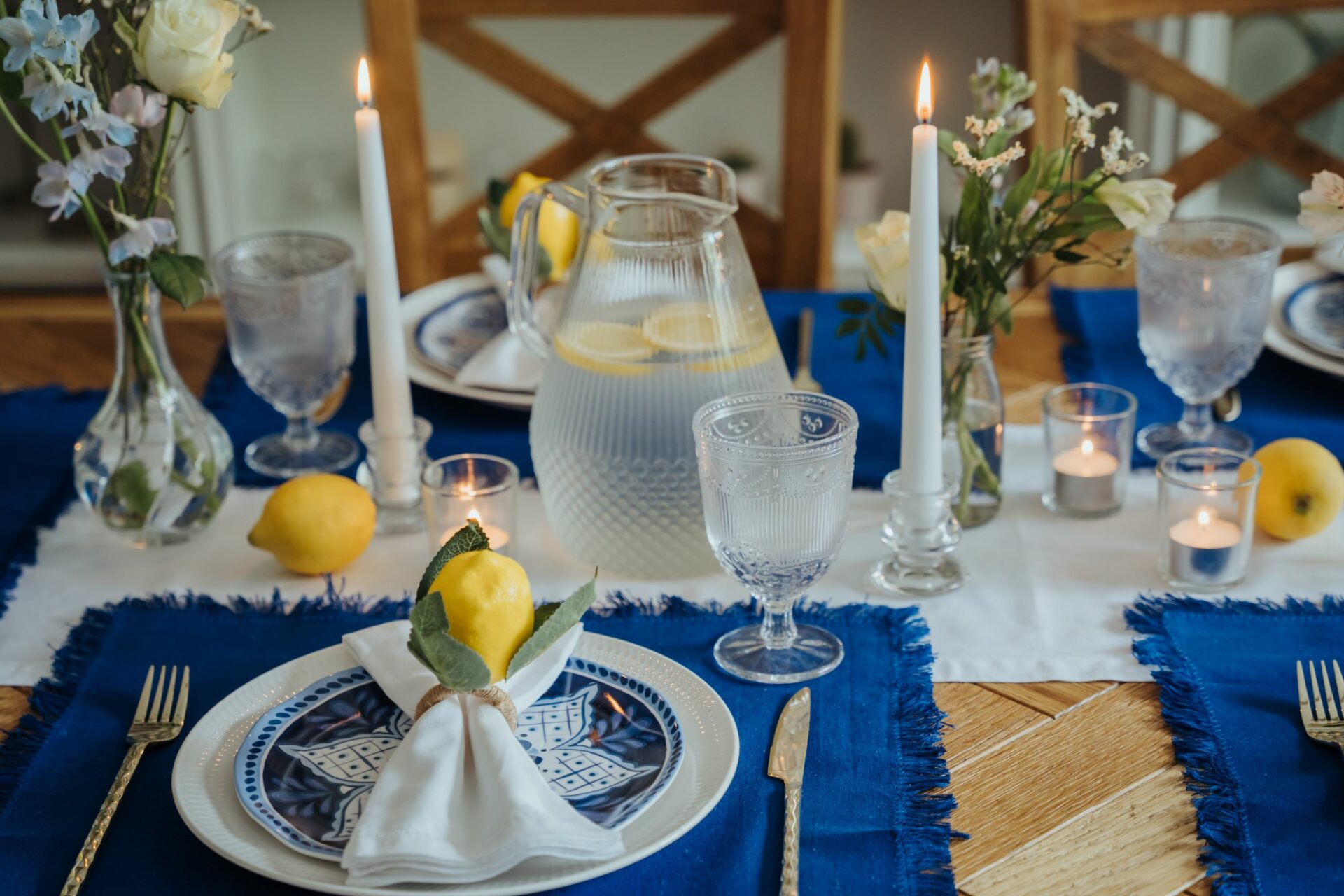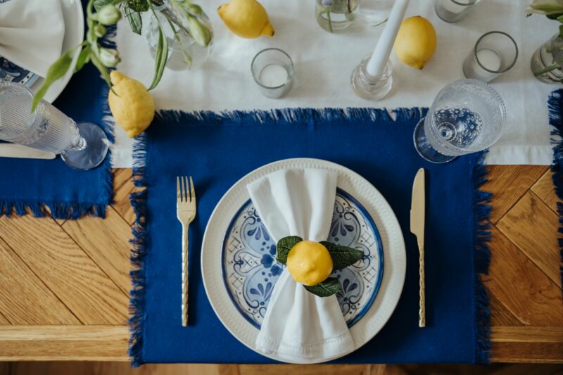 For an inviting tablescape, take inspiration straight from the kitchen by incorporating food-themed elements that feel both stylish and fun. Lemon-inspired tableware is a popular choice, bringing vibrant pops of yellow that instantly energise the space. Pair citrus-printed napkins, plates, or even the real thing with blue or natural woven placemats for a touch of escapism. This citrus-inspired decor adds a playful charm, perfect for brunches, summer dinners, or simply brightening everyday meals.